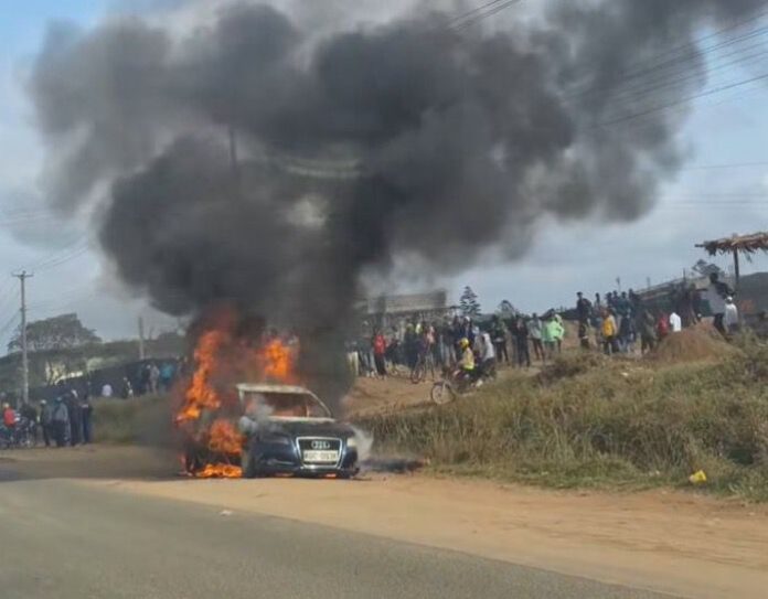 Panic erupted as the crowd dispersed, only to regroup moments later. In retaliation, the riders pelted the officer with stones before torching his Audi saloon car. Police officers arrived at the scene but were unable to save the vehicle, which was reduced to ashes.